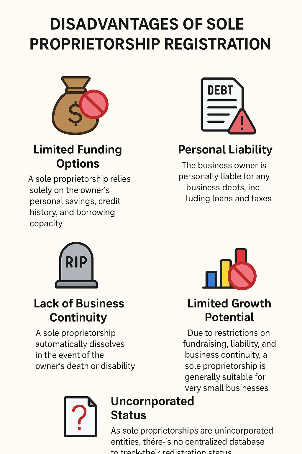 Limited Growth Potential: Due to restrictions on fundraising, liability, and business continuity, a sole proprietorship is generally suitable for only very small businesses in the unorganized sector. These limitations hinder expansion and scalability.